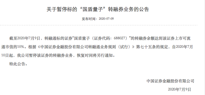 7月9日,国盾量子(688027.SH)在科创板上市来回,涨幅超9倍。当日晚间,该公司股票转融券业务遭暂停。