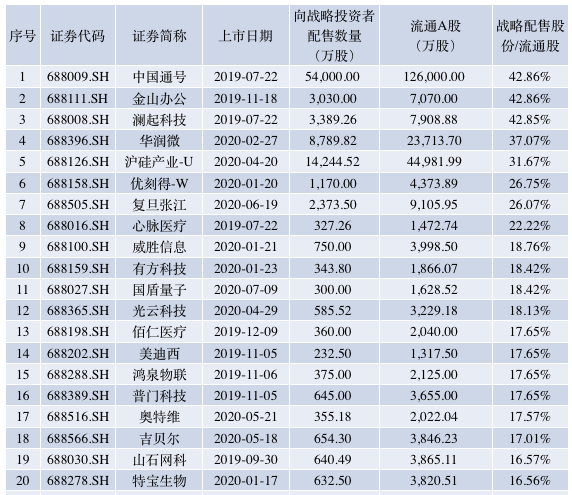 附:计谋投资者获配股份数占畅通股数的比例排行前20位的股票情况。