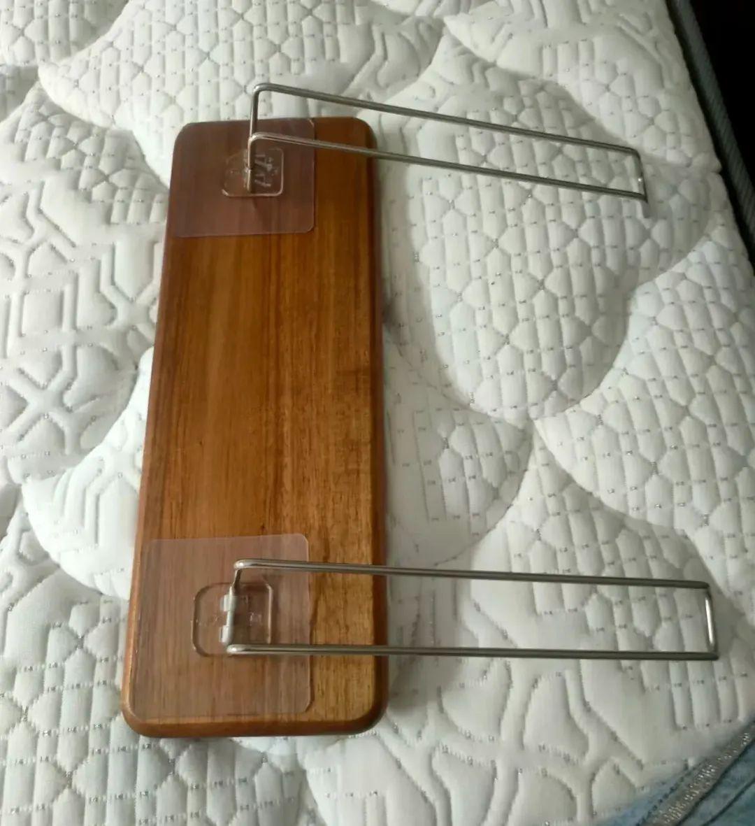 然后把衣架收纳架的两个不锈钢条,塞进床垫底下,上头的托盘竟然照旧能折叠的。