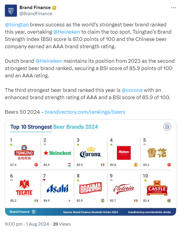 英国伦敦本事,2024年7月24日,总部位于英国的全球巨擘品牌评估商讨公司Brand Finance在官网发布2024年度全球啤酒品牌力top榜单和全球品牌价值top榜单,同期其twitter官方账号@青岛啤酒、科罗娜、和喜力三家公司官方账号,道喜青岛啤酒超过喜力成为24年度品牌力冠军,科罗娜取代喜力成为品牌价值冠军。